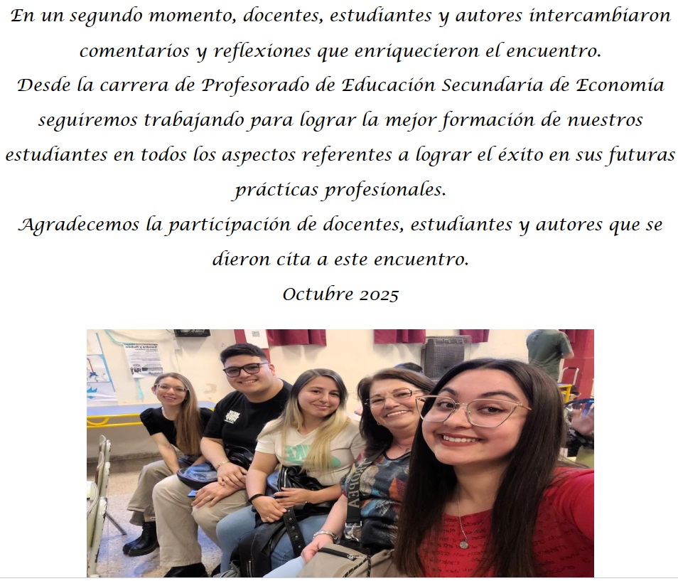 En el marco de las acciones de extensión de la carrera de Profesorado de Educación Secundaria de Economía, se organizó un encuentro para presentar el libro de “Didáctica de la Economía”, Debates y Aportes para la Formación Ciudadana en la Escuela Secundaria. Ed. DidacThema, 2025